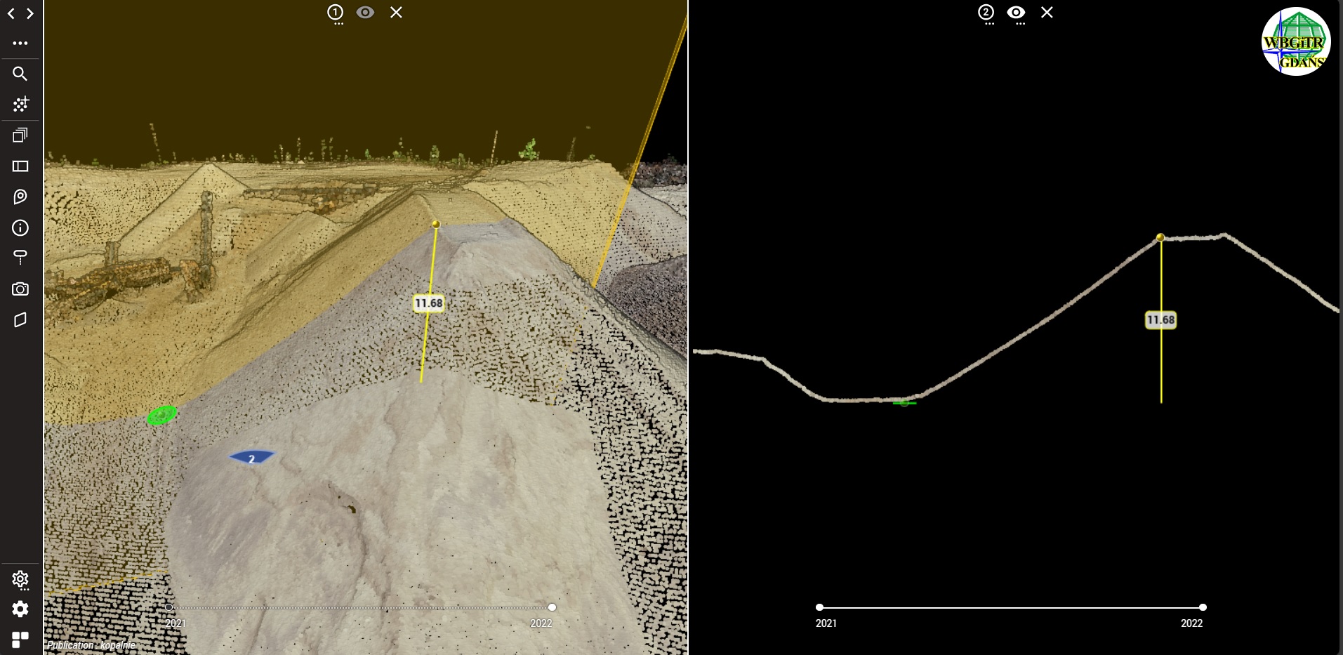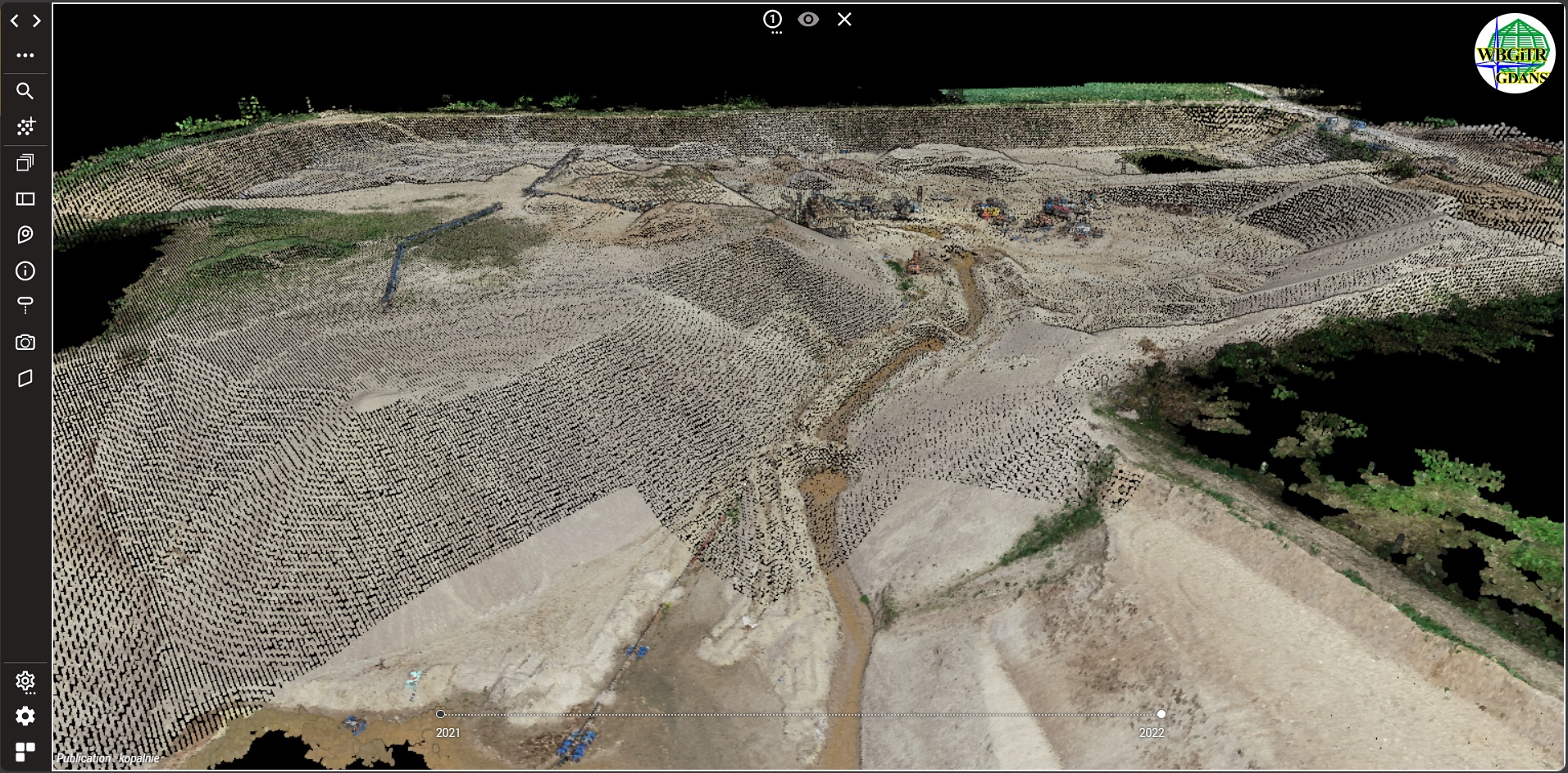 Publikacje są wykonywane w specjalistycznym oprogramowaniu mogącym wyświetlać dane w postaci chmur punktów, ortofotomap czy zwykłych plików wektorowych. Dzięki dostępności opracowań z poziomu przeglądarki internetowej zamawiający nie potrzebuje posiadać żadnego specjalistycznego oprogramowania generującego wysokie koszty, wystarczy tylko przeglądarka internetowa i ma pełny wgląd w wykonaną pracę gdzie z łatwością jest w stanie zweryfikować stan faktyczny obiektu porównując go z dokumentacją, którą posiada. Aplikacja webowa jest wyposażona w szereg funkcji, w tym możliwość pomiaru współrzędnych x,y,z na chmurach punktów, pomiaru powierzchni, pomiaru objętości mas kruszcu, wykonywania przekrojów itp. Poniżej wybrane opracowania, które wykonał zespół Działu Systemów Geoinformatycznych WBGiTR w Gdańsku.